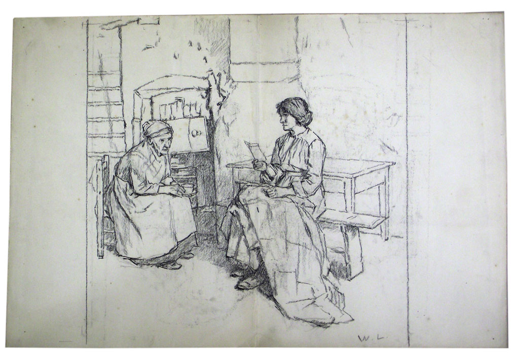 Description: Kitchen scene with old woman sitting by range with cup in hand, younger woman sat at table reading a letter. Probably a study for a larger oil version.