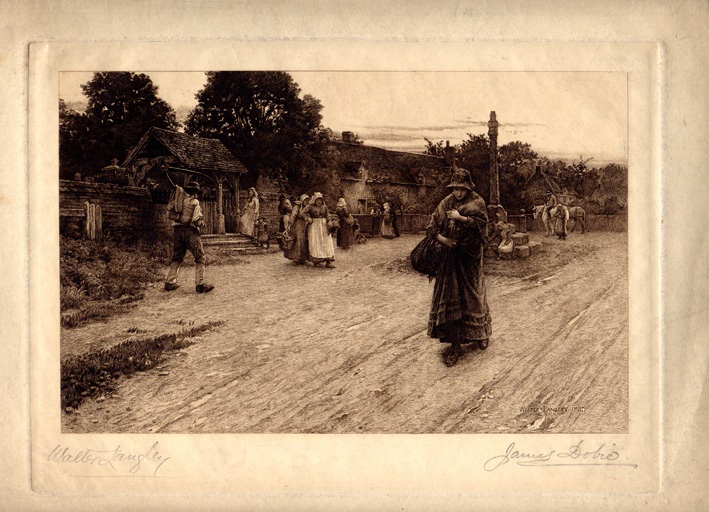 Description: Lithograph of Langley's oil painting of the same name. A young woman leaves the village with her, presumably illegitimate, baby.