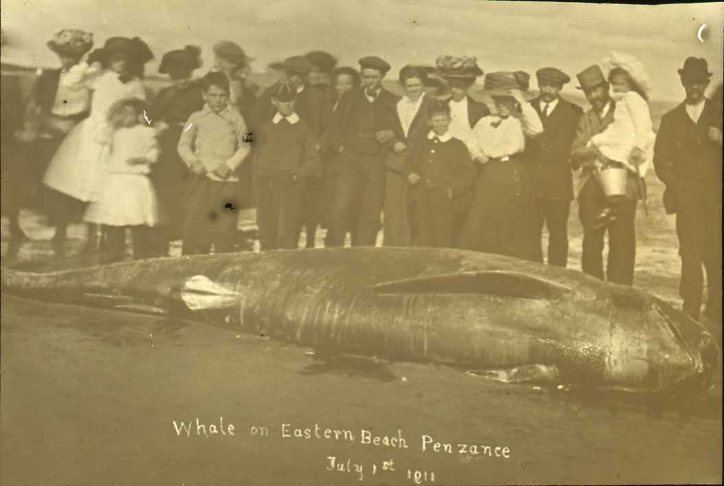 Description: This could taken from a postcard or a photograph printed with the caption 'Whales on Eastern Beach, Penzance' below. This appears to be a stranded whale with 20 or more people standing around the corpse. It was probably the occasion when about 60 pilot whales were stranded on the beach in 1911. They were not re-floated and Coastguard Lieutenant Chamber, in a humane gesture, ordered his men to shoot the whales.