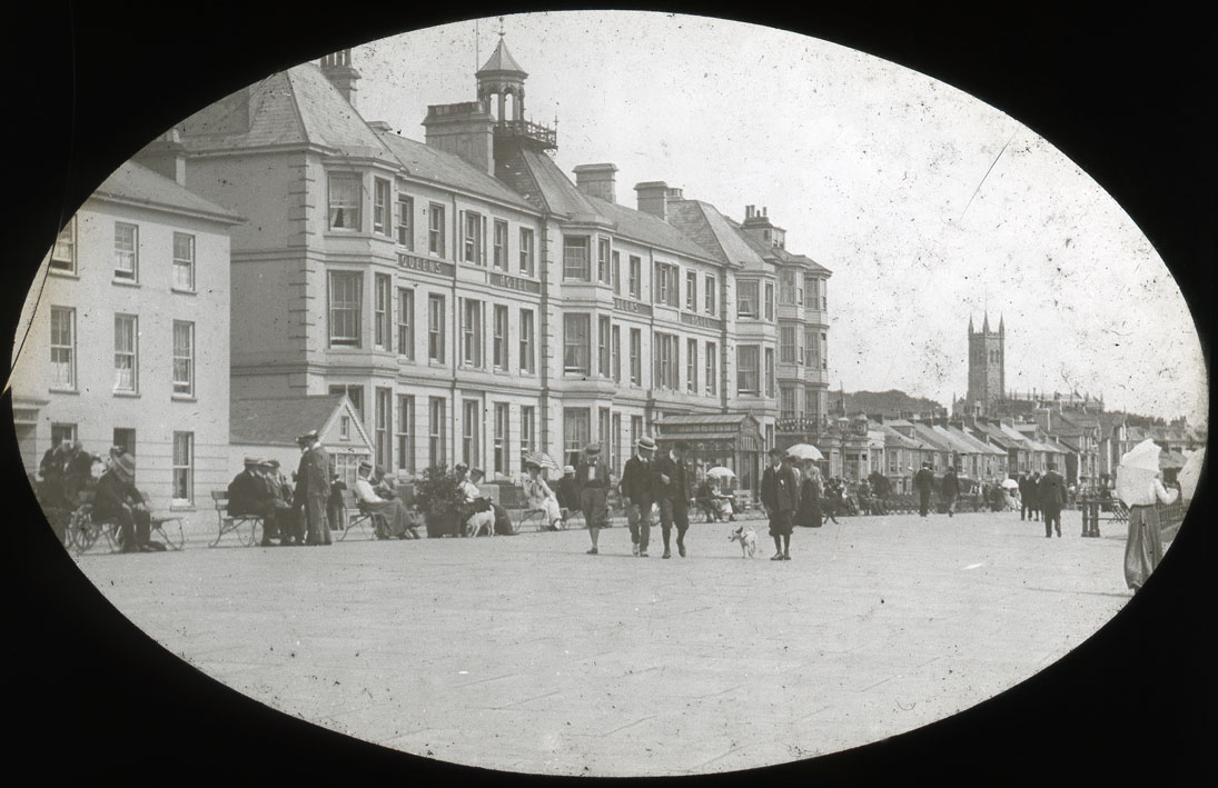 Description: A sunny day on the wide Penzance Promenade after the building of the Queen's Hotel with its observatory and before the building of the shelter in front of it. The tower of St Mary's Church is in the background.