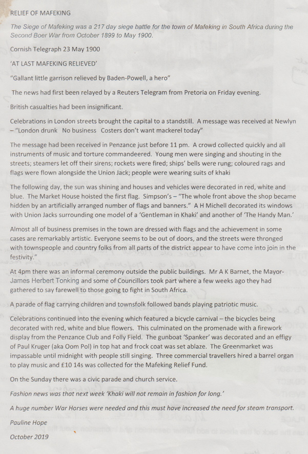 Description: It is thought that this could be part of a series of photographs taken of the celebrations in Penzance on 2 June 1902 following the British Victory in the South African Wars but it is labelled Mafeking Day 19 May 1900. The spectators seem to be awaiting a procession. The picture is taken in the afternoon sunshine outside Lloyds Bank, bunting and street gas lighting, with a police constable in the bottom right hand corner. The ladies wear boaters, bustles and ankle length skirts.