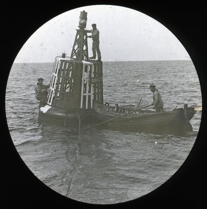 Description: Trinity House seamen servicing a warning buoy, possibly one marking the outer edge of the Runnelstone Reef. The Runnel Stone, or Rundle Stone, is a hazardous rock pinnacle situated about 1 mile south of Gwennap Head, Cornwall that used to show above the surface at low water until a steamship struck it in 1923. This is one of the most dangerous stretches of water in the UK with Wolf Rock Lighthouse and the infamous Runnel Stone Reef close by. It has seen many shipwrecks and lives lost. This buoy featured several warning devices including a red and white painted cage for daytime visibility, a gas powered flashing light for night time visibility. Acetylene gas was probably stored within the cage. A compressed air whistle or hooter sounded as a fog warning. The action of the waves compressing a column of air in a central tube system would activate the sound.
