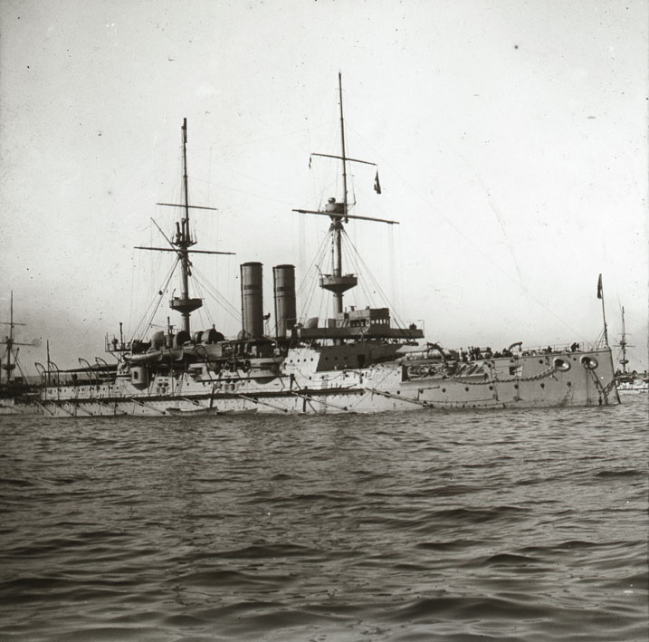 Description: HMS Royal Oak in Mounts Bay for the August 1904 Fleet review. This is a pre Dreadnought Battleship.