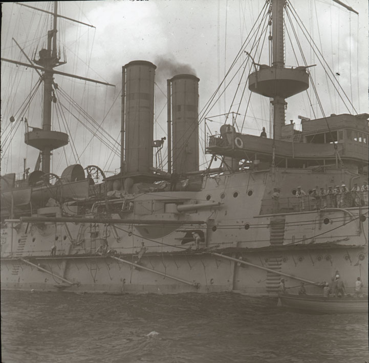 Description: The picture shows the pre dreadnought battleship HMS Royal Oak of the Home Fleet's 2nd in command in Mounts Bay in August 1904. This is not the HMS Royal Oak which was torpedoed at Scapa Flow in 1939; this one was scrapped in 1914. During the 1904 visit, HMS Barfleur and Canopy collided. A stoker aboard HMS Drake died of TB and during boat drill the carpenter from HMS Swiftsure was lost overboard. The steam from her funnel would indicate a rather windy day.