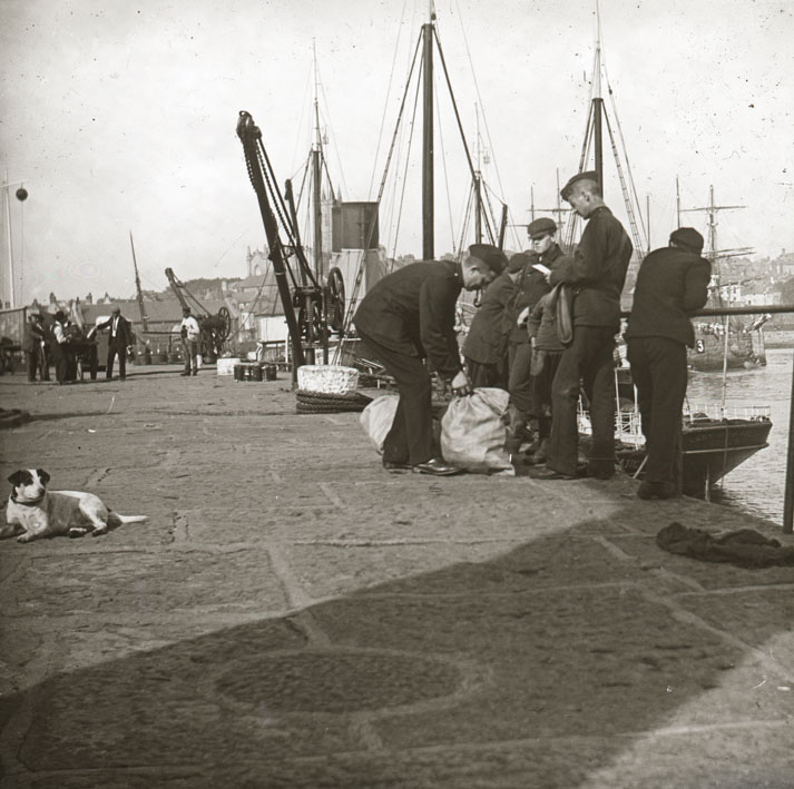Description: Royal Marines handling the mail bags at Penzance are seen acting here as naval postmen. Behind them are the steamers Lyonnesse and the Lady of the Isles alongside the pier, the stern of the latter just appearing through the railings on the right. The presence of the Lady of the Isles moored here dates this scene before 1904. The picture was probably taken during the visit of the Fleet in 1904. Note the circular inset in the granite paving of the quay marking the spot where the old warping capstan once stood.