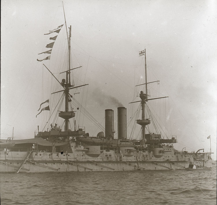Description: The picture shows the pre dreadnought battleship HMS Royal Oak of the Home Fleet's 2nd in command in Mounts Bay in August 1904. She has a hoist of flag signals on her main mast. This is not the HMS Royal Oak which was torpedoed at Scapa Flow in 1939; this one was scrapped in 1914. During the 1904 visit, HMS Barfleur and Canopy collided. A stoker aboard HMS Drake died of TB and during boat drill the carpenter from HMS Swiftsure was lost overboard.