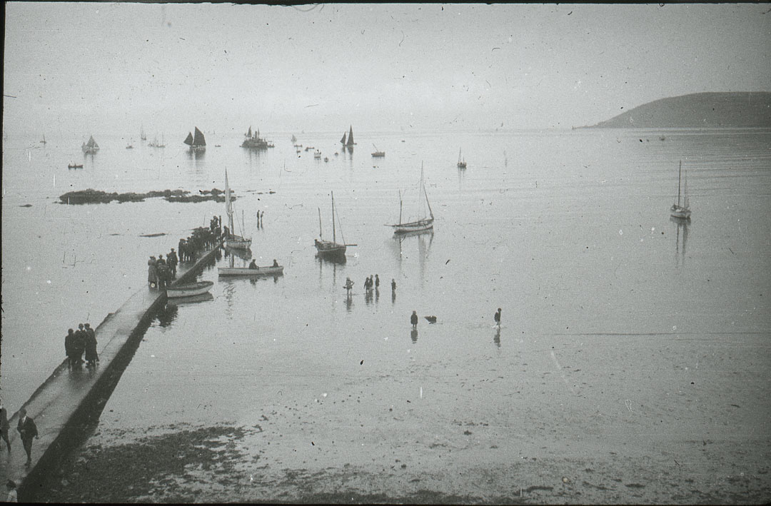 Description: It is low tide at Penzance. The narrow pier is being used as a landing and boarding stage for holidaymakers. It may be covering the drainage pipes almost opposite the Queen's hotel on the Promenade and it may still have been in place in the 1930s