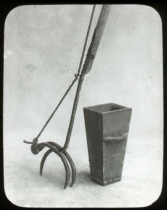 Description: Wreck tongs and water glasses were used to recover articles lying on the seabed. The water glass is a tapered wooden box with handle(s). Open at the top, its bottom is closed by a piece of glass which could be held over the side of a boat, pushed down into the water, enabling the handler to see more effectively anything lying on the sea bed or on a submerged wreck. It eliminated disturbing reflections from the surface of the sea. The wreck tongs were used to grab and recover anything seen by the water glass. The wooden handle might be anything up to 18' long and the double tine of the tongs was hinged. It was closed by pulling on the atttached cord. These implements, once common household items in Cornwall, may have been used by smugglers.