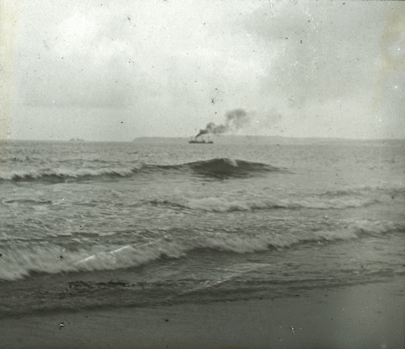 Description: The sandy foreshore and the indistinct coastline indicate that the picture could be Mounts Bay but it is too blurred for confirmation.