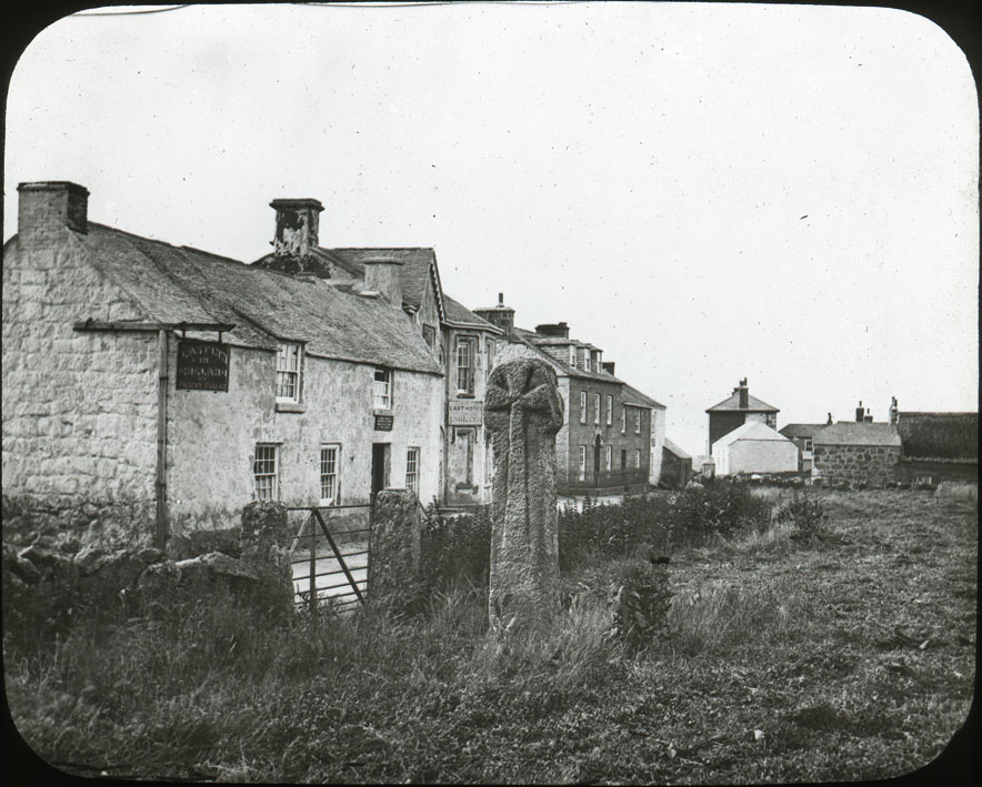 Description: This is Sennen Churchtown orTreeve photographed from beside the main road from Lands End, with the First and Last Inn on the left and the Dower House built by the Vingo family with its attic windows and the Sennen cross in the field. The OS map 25 of 1877 shows the cross in this field It is a farming settlement which can trace its history back to the Bronze and Iron Ages. Treeve first appears in surviving documents as Treryf in 1334 and as Treruffe and Treyeuff in 1668. In a note dated 5 May 1864 John Thomas Blight wrote that this cross lay across a little stream at Trevear Barton, Sennen, where it was in use as a footbridge. It has a quite distinctive design, resembling a soft, long ribbon bow. In about 1890 the cross was moved to the new cemetery adjacent to the old Sunday School, north of the church and in 1955 it was moved to Sennen Churchyard where it can be found in 2011.
