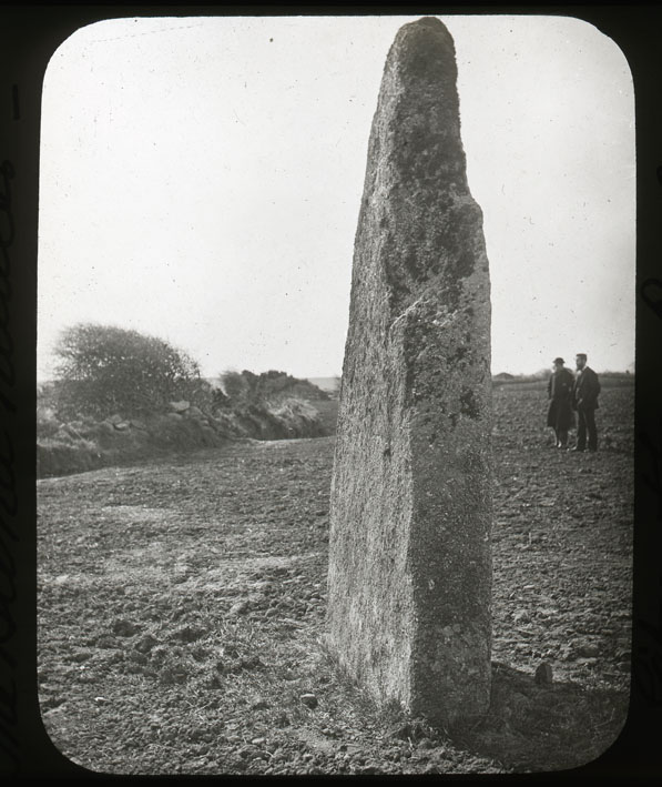 Description: Known as the Blind Fiddler, Trenuggo or Tregonebris, this quartz studded granite menhir is over 3.3 metres (11') high, 2 metres around at ground level. Legend has it that a fiddler was turned to stone for playing on a Sunday. It is said that bone fragments and ashes were found at its base in the nineteenth century.