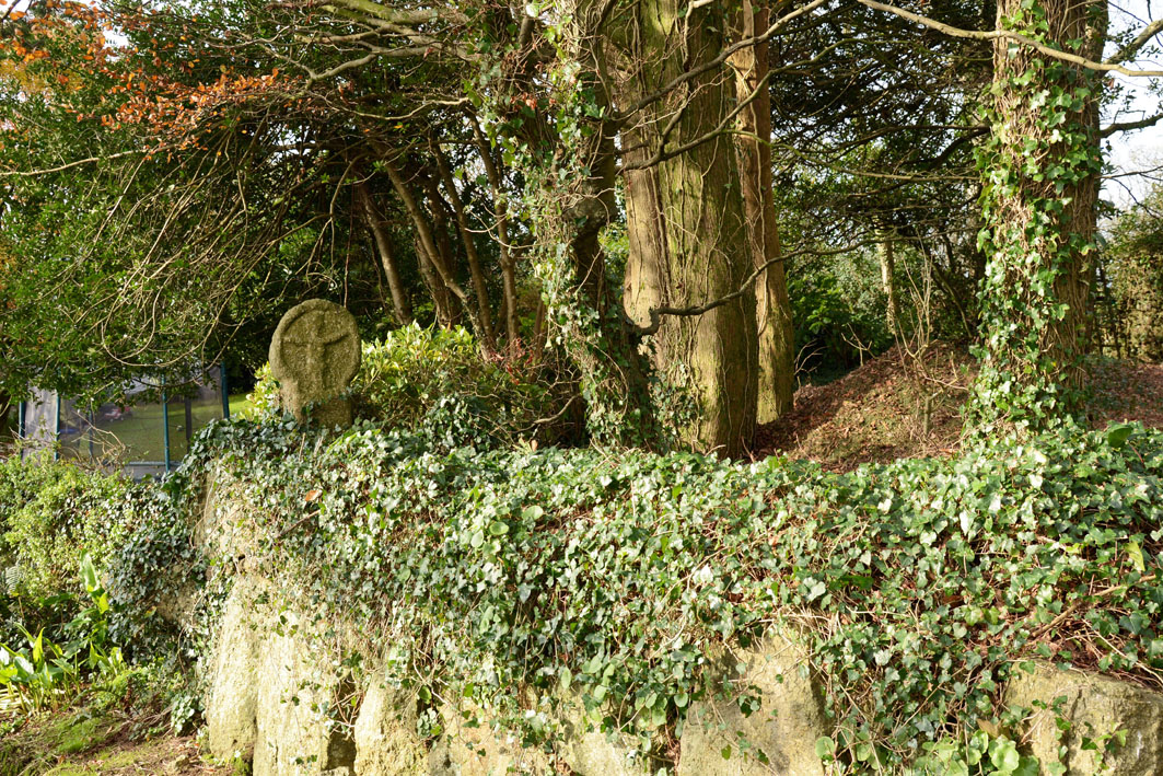 Description: Rosemorran Cross, Gulval. In his scrap book John Blight noted that it was “a beautifully preserved cross standing on the corner of a hedge behind the stables at Rosemorran in Gulval.”