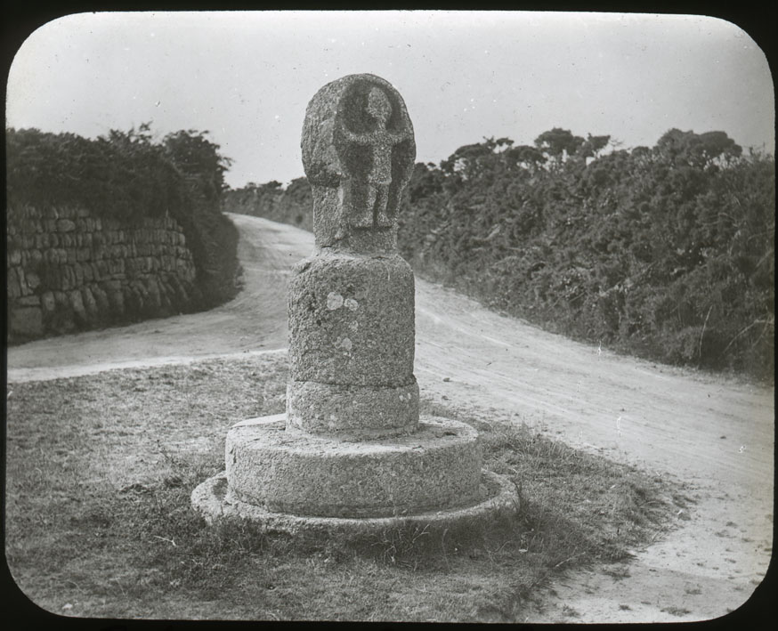 Description: Boskenna stone cross - height 2.05 m (6' 10"); height of cross .65 m (2' 4"); width of head .50 m (1' 8"); width of shaft .31 m (12.5"). The cross is mounted on a stone roller, millstone and cider press. The front of the Latin cross head bears a Christ or child figure carved in relief. The rear shows a wheel-cross formed by four triangular incisions. The cross was found buried in a hedge and was re-mounted possibly in its original position, on a triangular piece of grass near the Merry Maidens.