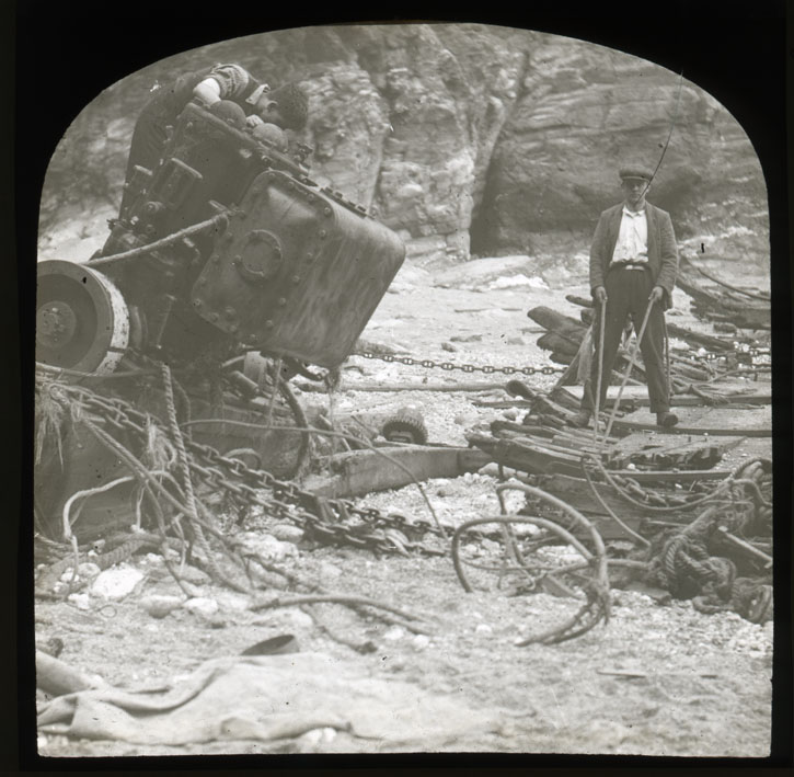 Description: The wreck of the Sarah Anna Evans. In the aftermath of the wreck on 30 October 1932, wreckers get to work. The hull has completely gone to pieces leaving a tangle of wreckage and the engine block. A young man leans over the engine block looking for salvageable pieces. An older man appears to be holding a pair of long handled cutters, liberating bits from the tangled remains.