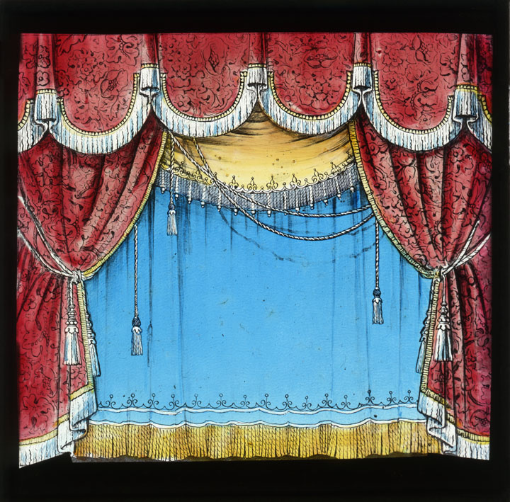 Description: This is a picture of red curtains with pelmet revealing a blue curtain with yellow fringe and pelmet designed to make a fitting opening and closing for a magic lantern show.