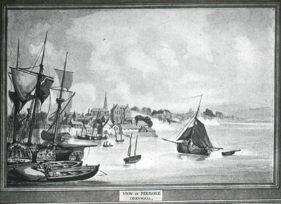 Description: This photograph is of a painting of Penzance Harbour. Judging from the rig and style of sterns in the vessels on the left, this painting probably dates from the late 17th century. The old St Mary's Chapel of Ease with its distinctive spire was demolished in the summer of 1832. Below it are the large buildings at the bottom of Lady or Chapel Street. The site to the right later housed the Gas Works and other semi-industrial buildings and warehouses. The larger vessels on the left lie under Penzance Pier upon which the artist must have been seated. This area is known as Tin Man's Hole as it is where the tin ships lay in between their quarterly voyages to the Royal Mint in the Tower of London with about 50 tons of ingots of tin. Calling in at Falmouth, they returned with a wide range of natural and manufactured goods for the Penzance shopkeepers and merchants.