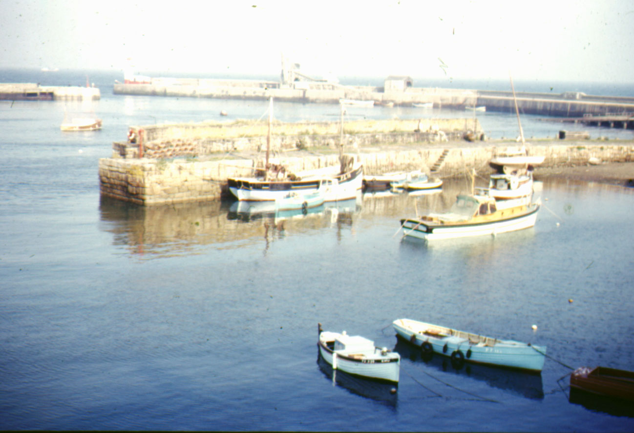 Description: On the South Pier centre back lies the lighthouse and a gravel chute for loading the coasters for Penlee Quarry. The United Boys PZ18, a liner and drifter, is moored alongside the Old Quay which has lobster pots on it. The Cornubia lies in the water; she is a Cornwall Sea Fisheries patrol boat. The repair slip is on the right.