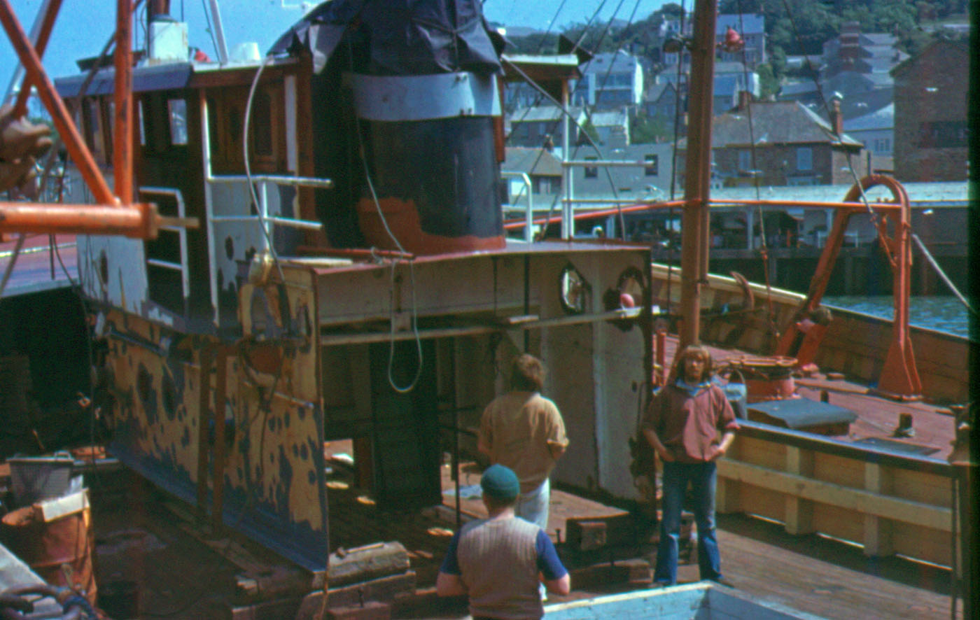 Description: A poor quality photograph shows the crew on board a trawler in Newlyn Harbour.