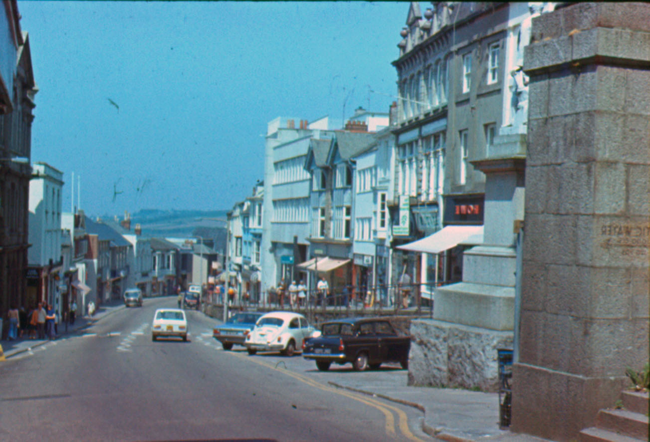 Description: Market Jew Street, Penzance, with Rowes the Outfitters on the left; Cooperative Butchers has the second canopy on the left above Barclays Bank. The cars, left to right are a Volkswagen Beetle, an Austin Morris van and a Ford Anglia 100E or 105E.