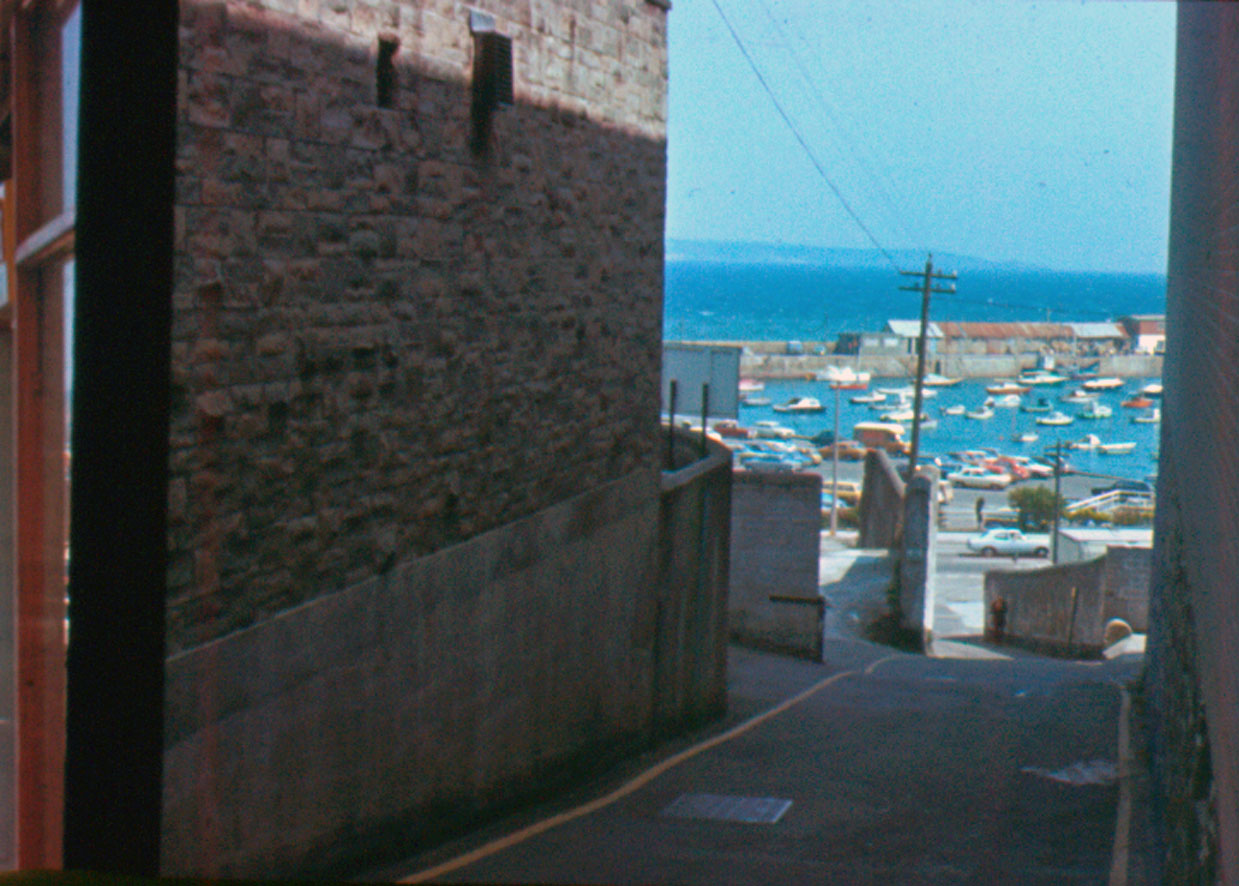 Description: New Town Lane runs from the middle of Market Jew Street to Wharf Road. It shows the car park newly built over the harbour. In 2012 the building on the left is a pizza cafe, the building on the right a Poundstretcher shop.