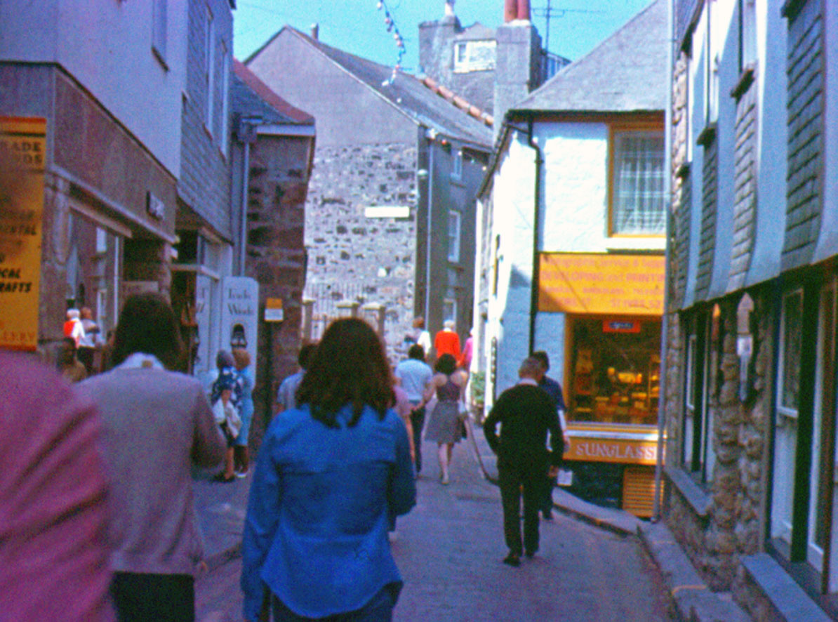 Description: This is Fore Street, St Ives, with the Camera Shop on the right by the entrance to Court Cocking leading down the steps under an arch to Wharf Road. The central street sign is for Salubrious Place; the centre pillars form the entrance to the Zion Congregationalist Chapel which had connections with the Countess of Huntingdon.