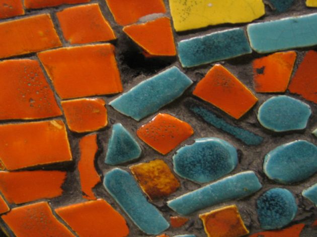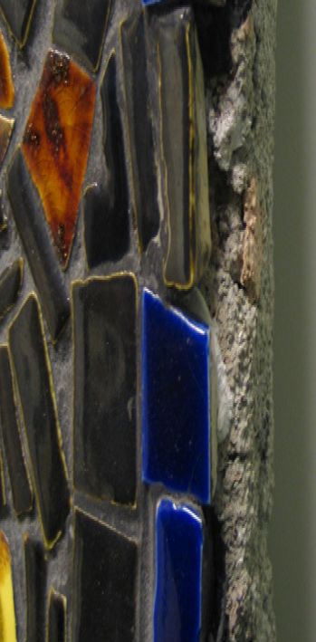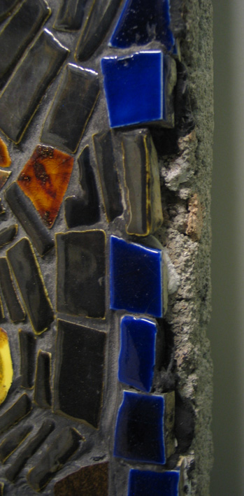 Description: Mosaic panel made from multi-coloured tiles and featuring three crusaders on horseback. It was made by Eric Leaper for the wall of his Chapel Euny Pottery.