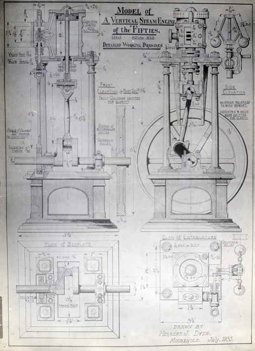 Description: Technical drawing: Model of a vertical steam engine of the 'fifties
