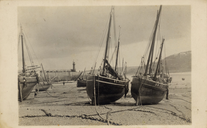 Description: Postcard of St Ives harbour with two fishing boats moored