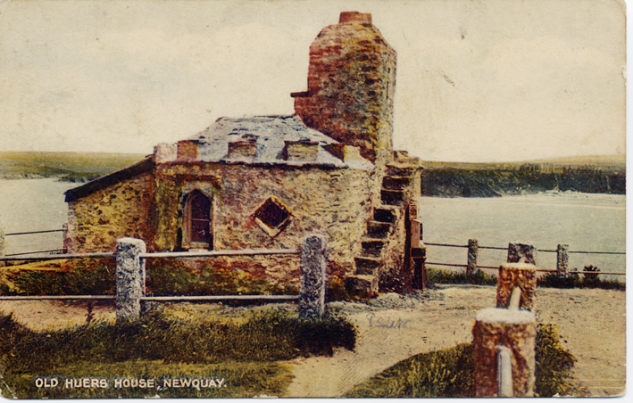 Description: Postcard of the old huers house at Newquay, hand-coloured