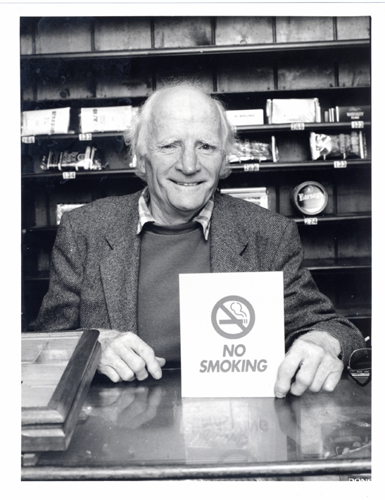 Description: This is a smiling portrait photograph of Dennis Scobey, proprietor of Bassett, Cigar Merchant, 12 Market Place, Penzance. See also PEZPH 2011.177 for another portrait and PEZPH 2011.174 for the shop's centenary celebrations.