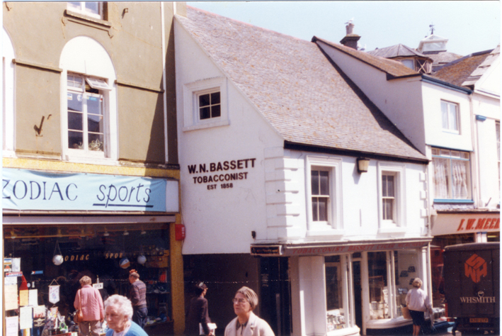 Description: This is a sunny view of front of Bassett, Cigar Merchant, 12 Market Place, Penzance. Meek's furniture shop to the right also celebrated 100 years in business. Note the observatory on its roof. In 2015 the old tobacconist's is a cafe and Meek's houses offices for the Cornishman newspaper, a cafe and offices.