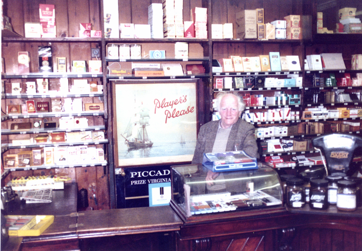 Description: This is the interior of Bassetts shop,Tobacco and Cigar Merchant of 12 Market Place, Penzance with Mr D E Scobey behind the counter. He retired on 16 August 1985.