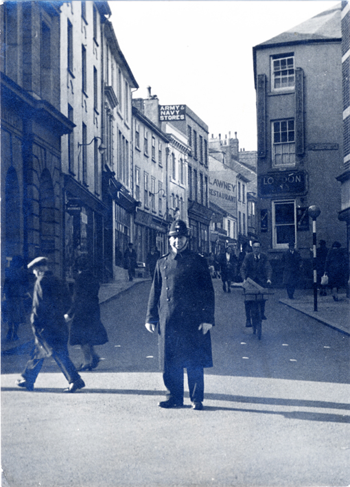 Description: A smiling policeman is standing at the bottom of Causewayhead, Penzance. Near the junction with Bread Street to the right is a Zebra Crossing to control the two way traffic in this busy street which had pavements both sides.
