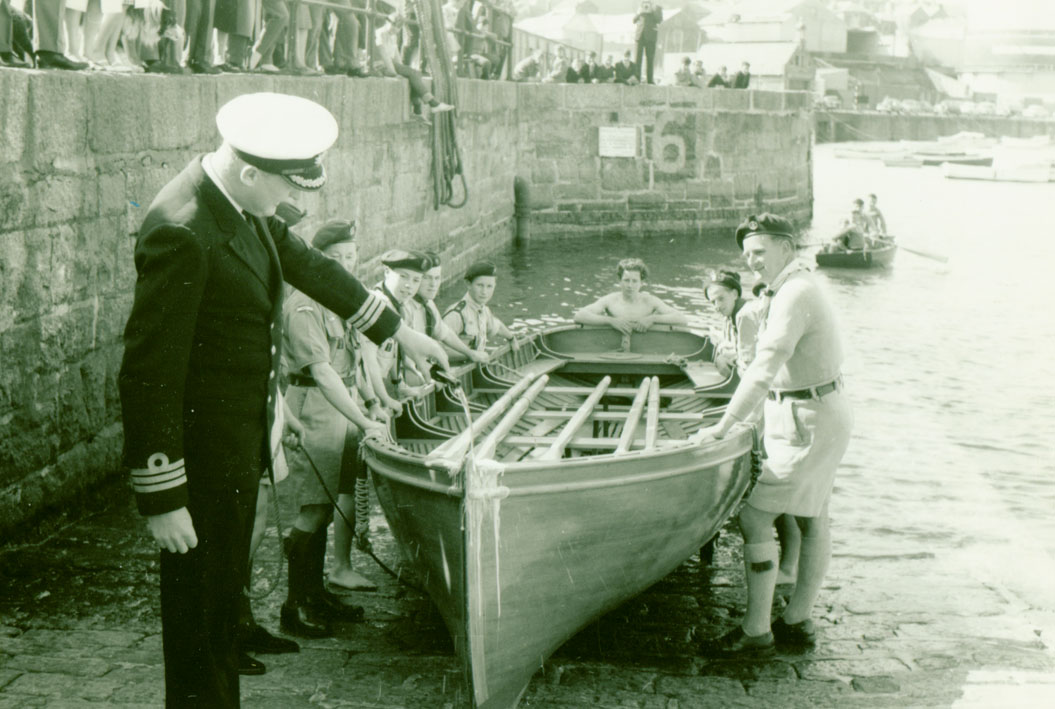 Description: This is a photograph of the launch of the Penzance Sea Scouts' new boat