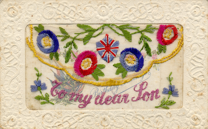 Description: Embroidered silk postcard with pocket and flap. "To my dear Son" is embroidered on front, and a card in the pocket says "Birthday greetings" On the reverse is written "From Dada".