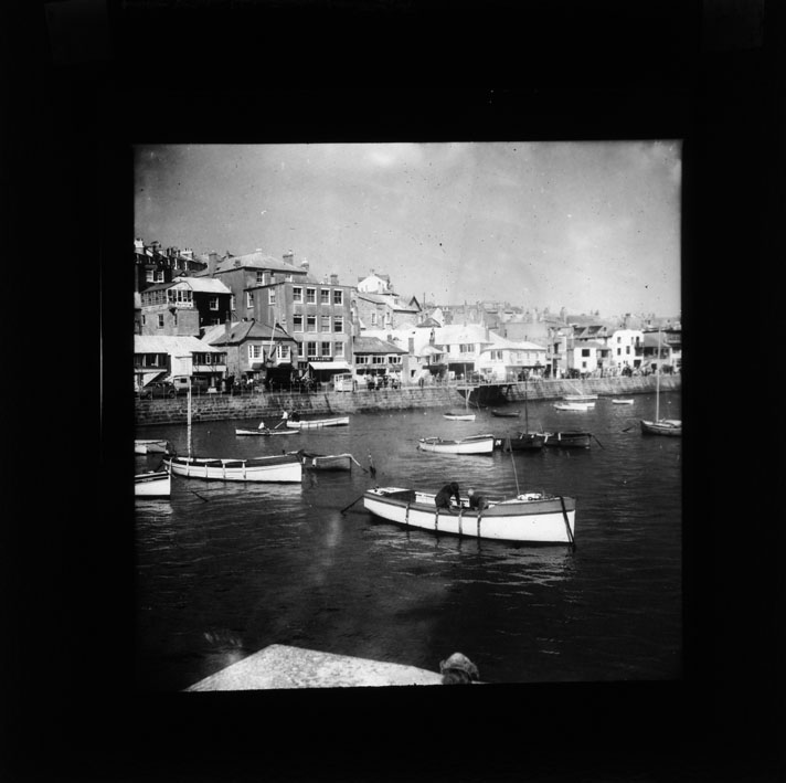 Description: From left to right: Customs House; probably the Uncle John, the last St Ives clinker built gig; Martin's/Woolworths/Pizza Cafe; amusement arcade; Crimson Tours; band stand; Shore Cafe; Court Cocking; varnished clinker hire skiffs built by John R Cothey