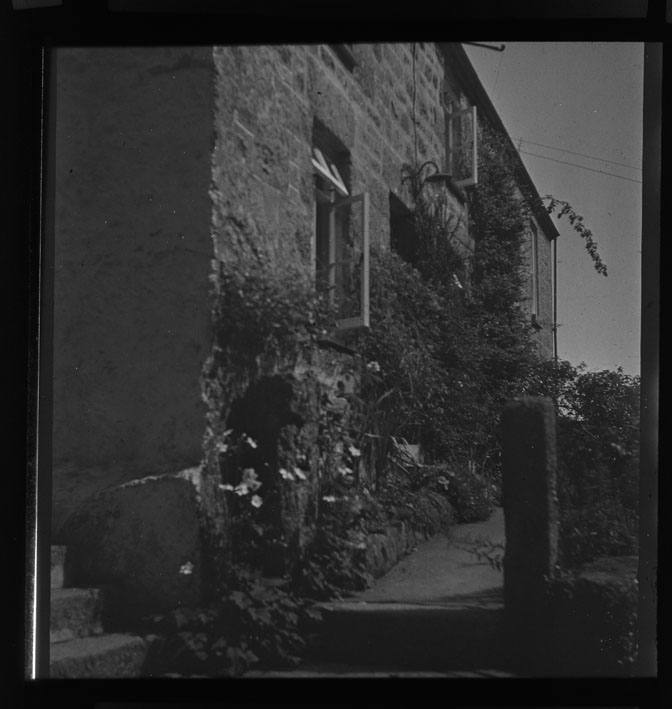 Description: A granite post is at the entrance to this house with flowers climbing its walls.