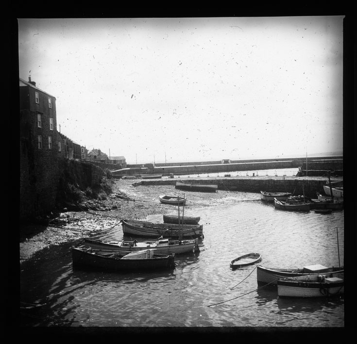 Description: This was the view from below the cliffs in front of the Red Lion overlooking the Old Quay towards Newlyn's South Pier in the distance. One section of its wall was removed for a possible scheme to build a road below the cliff to link it with the Strand beyond the North Pier. The large buildings were accommodation with fish cellars and pilchard tanks. Below, is a fresh water chute piped from Jacob's Well. Bottom right are moorings for Toshers which were used for mackerel fishing with feathers, not lines nor hooks.