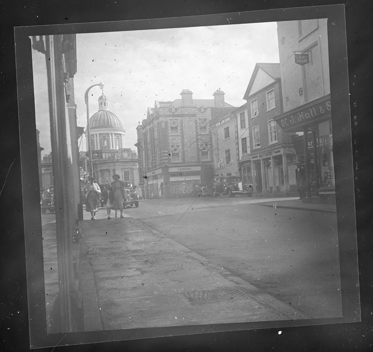 Description: From left to right: Lloyds bank with advertising hoardings; Lennard's Shoe Shop, one of many such in the town; The White Lion; Matthews, the fruiterer and florist with its pillars; N J Hall, the high class provisioner; above which is a hanging sign for Gilbert's Wines.