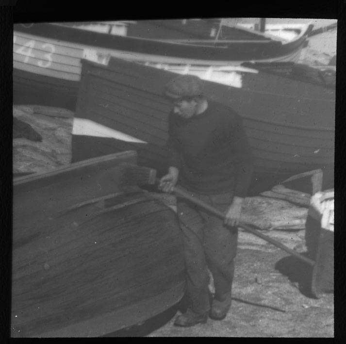 Item: A fisherman sporting a Guernsey jumper, painting a punt on an unknown beach.
