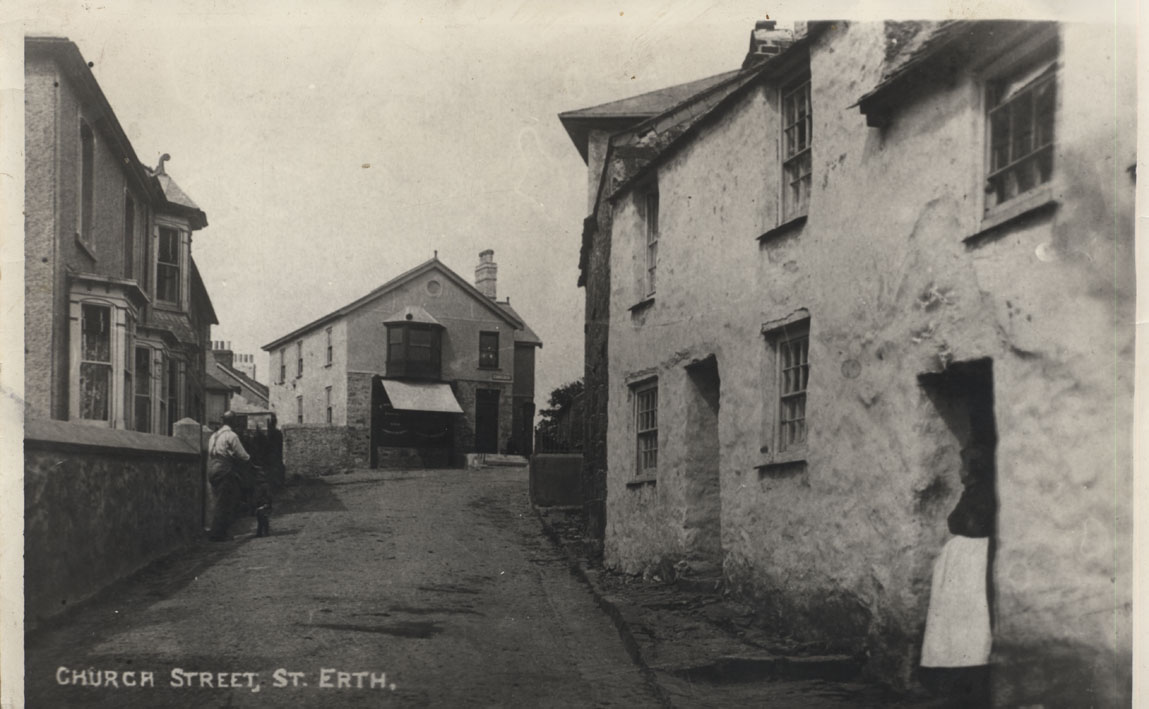 Description: Church Street, St. Erth. An unidentified man and small boy look away from the camera. The Post Office built in 1929 is in the centre of the picture. The Star Inn is at the top of the street on the right, and the cottages on the same side were demolished in the 1960s. A lady in a white apron stands in a doorway on the right looking away from the camera. Holbrook House and the site of the former Bible Christian Church are on the left of the street.