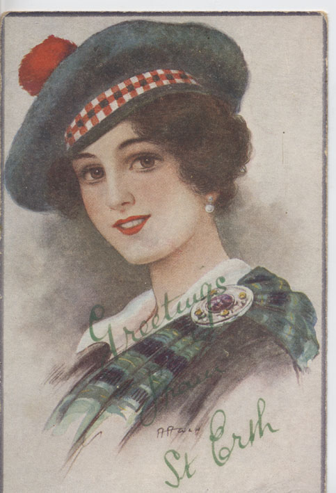 Description: Head and shoulders portrait of a woman wearing a Scottish tam 'o shanter and tartan sash. Overprinted are the words 'Greetings from St Erth'.