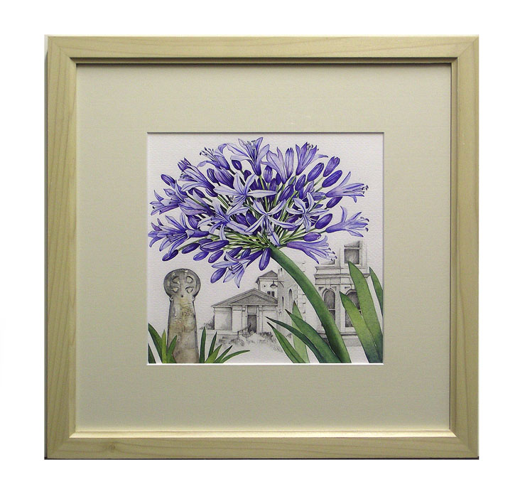Description: Watercolour of an agapanthus with Penlee House and the Penzance Market Cross in the background.
