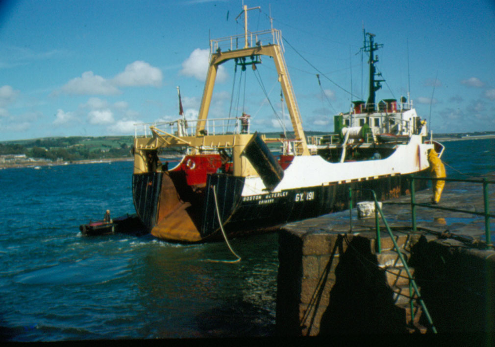 Description: The Boston Beverley GY191 is pictured at Penzance during the mackerel boom of the 1970s. She was completed in 1971 by Richard Dunstan of Hessle for Boston Deep Sea Trawlers. She was the first deep sea trawler to box all of her catch. She was 150' long, powered by a 1450 hp English Electric engine. With a crew of 23 her home port was Grisby. As Iceland, Faroe and Norway extended their territorial waters, this kind of trawler had nowhere to fish, so they came to Cornwall for mackerel. In 1979 she was sold to Chile, taken over by the Chilean Navy in 2005 and wrecked in the Magellan Strait.