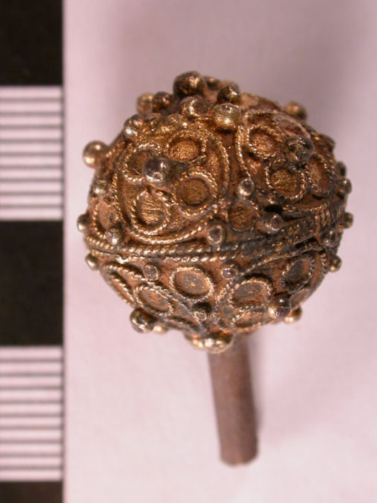 Description: Silver gilt dress pin with a decorated spherical head joined by twisted wires. The pin shaft is broken off at 11mm below the head, and some gilding survives