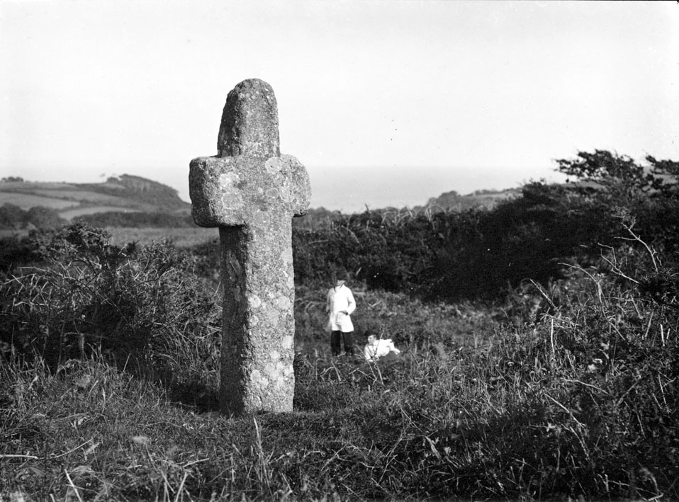 Description: A photograph showing Tremethick Cross on an angle, and the open countryside around with two men in white coats and bowler hats (one laying on the ground) looking on. This Latin Cross was discovered at Rose-an-Beagle in the parish of Paul and was moved to its present position on the St Just road at the entrance to Tregaverah Lane in the mid 19th century. The cross is set up on its original base, but a few years ago it was struck by a large lorry travelling to St Just and broken into three pieces. It was recovered from the field by members of Madron Old Cornwall Society and eventually restored with metal rods by Adrian Thomas, stonemason of St Just.