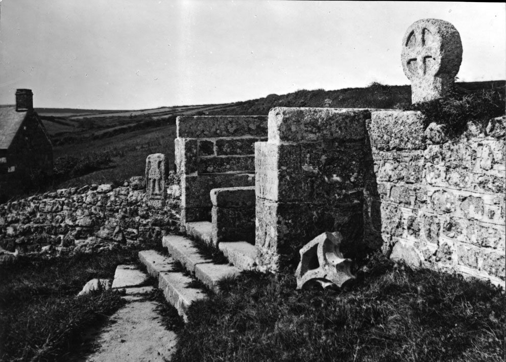 Description: Mounted on a stile behind the church, a photograph of top of the cross in St Levan churchyard taken from outside the wall. It has a short chamfered shaft beneath a rounded headed with a Greek cross in relief.