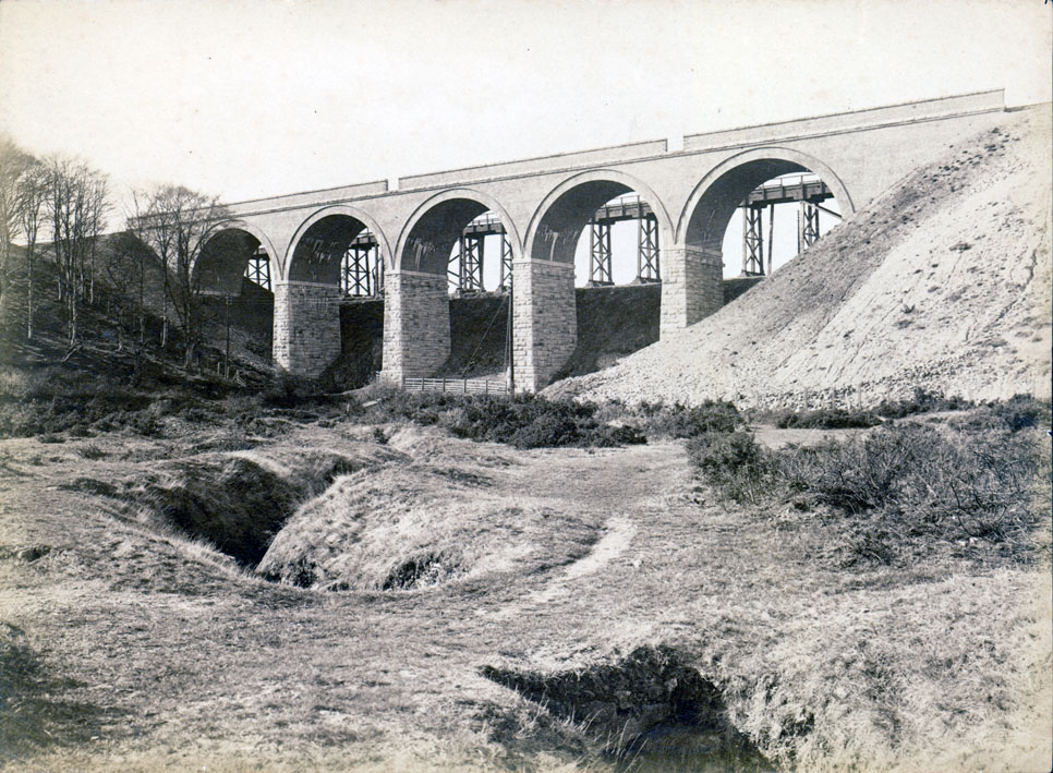 Description: A view of the new stone Penponds Viaduct from the south elevation with the disused old wooden structure behind. Penponds Viaduct is 1.25 miles to the west of Camborne Station on the main Penzance to London line. The original incline plane was built by the Hayle Railway Co. to join up with the Redruth Railway. When the Cornwall Railway Co. took over they line, they added a timber trestle viaduct to overcome the difference in levels. G.W.R. took over the main line and in 1888 built the present granite and brick viaduct to replace the timber one. This dualled the line. Remains of the incline plane are still evident and the original tunnels for the road and river remain unchanged. See also 2016.50.1174