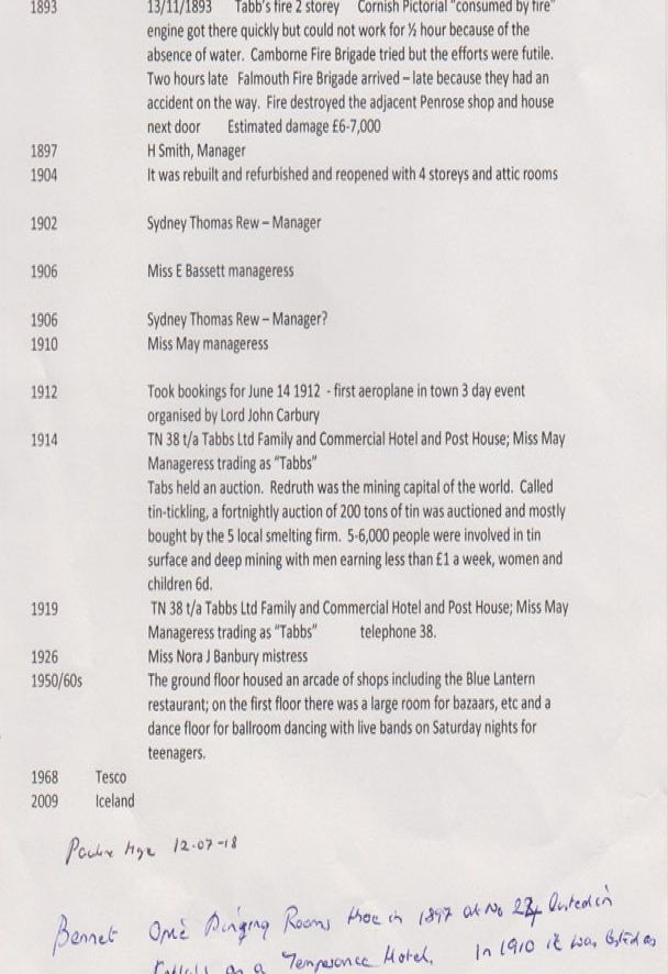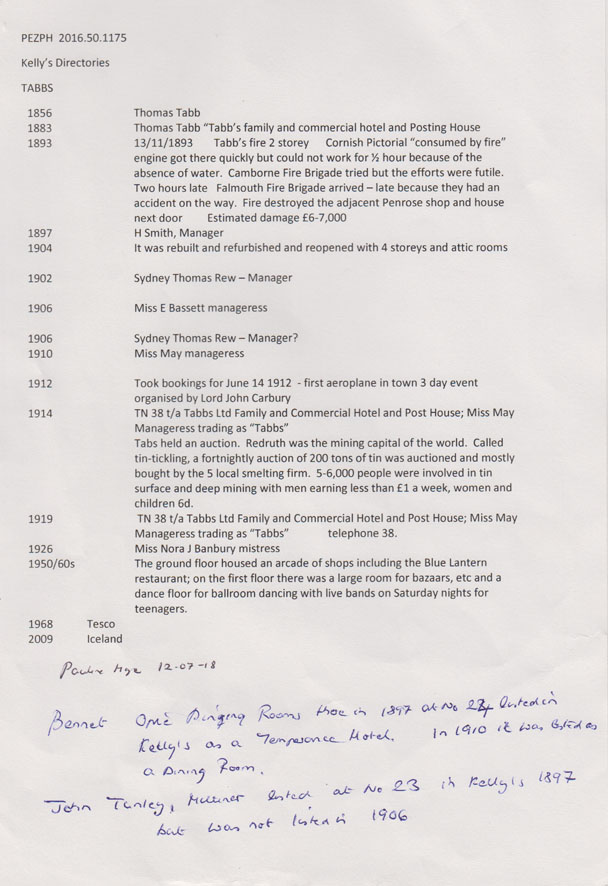 Description: A photograph of Tabbs Hotel, Redruth and unidentified people stood on the pavement facing the camera. To the left of the hotel is B. Opie's dining rooms and beds; and John Tunley (dressmaker). To the right is G. Oliver (boot seller). More information about the premises is contained in the attached extract from Kellys Directories.