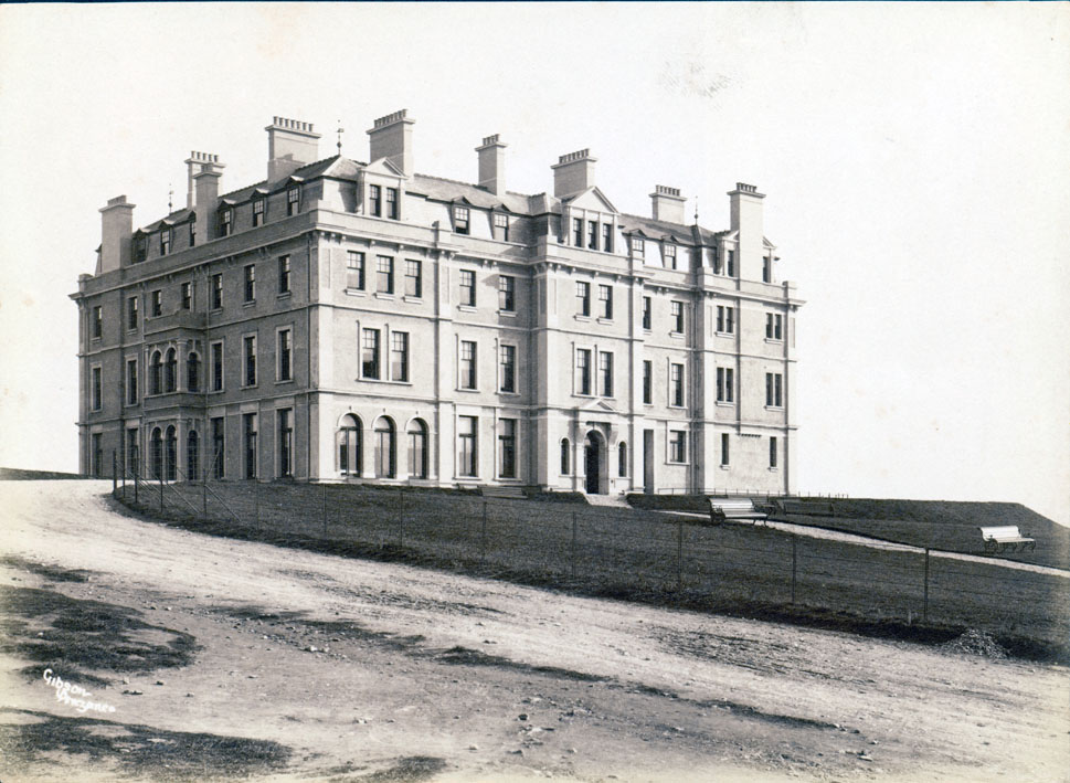 Description: A view of the Atlantic Hotel at Newquay, with two bench seats on the lawns outside. In the late 19th century, the founders of the hotel located a 10 acre site, which would enable them to create a building with each room having stunning views of the Atlantic Ocean. The architect was Silvanus Trevail and the hotel had 100 apartments and was opened in 1892. The opulence of the interior helped quickly build a reputation for the hotel. Harrods designed and furnished the cocktail lounge in 1935. It was used for a hospital for the wounded during WW1. In 1986, a refurbishment began, and part of the plan was to retain the original features. Over the years, celebrities have visited including The Beatles in 1967, to film part of their "Magical Mystery Tour". Source: https://atlantichotelinnewquay.co.uk/home/the-history-of-the-atlantic-hotel/